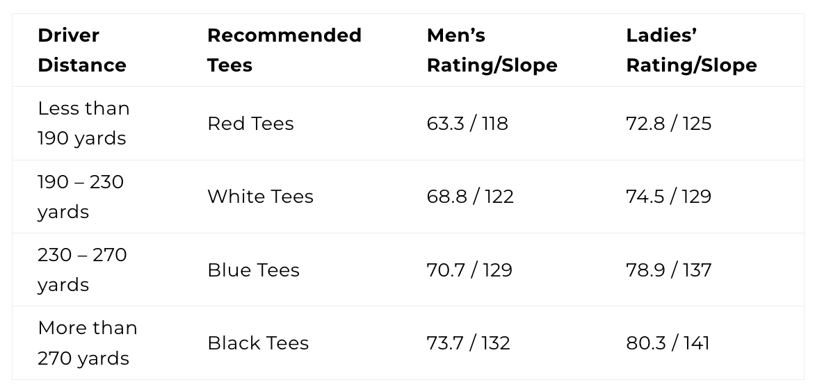Choosing the appropriate set of tees is encouraged for your enjoyment and pace of play.